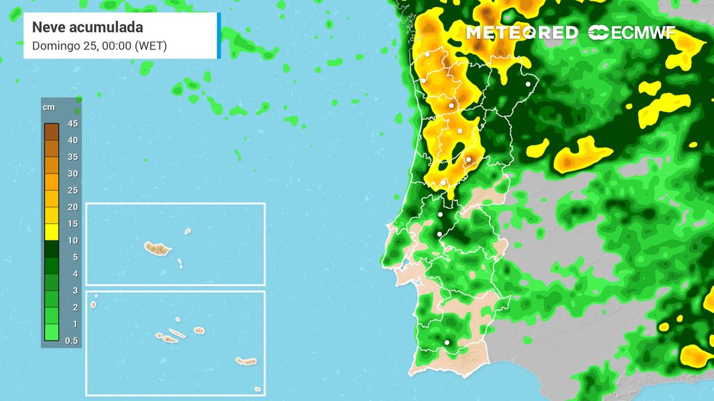 Os nossos mapas mostram as acumulações mais significativas na Serra da Estrela (até 38 cm), na zona de Amarante (até 37,5 cm) e em Lindoso, próximo à fronteira com Espanha, com valores até 37 cm. No entanto, os valores que mais impressionam são os que aparecem na região do Grande Porto, como o caso de Amarante e áreas adjacentes, e como casos mais próximos do litoral, como Paredes, onde se denotam acumulações até 22 cm. Aqui a incerteza aumenta, tendo em conta a altitude destes locais, no entanto, não podemos deixar de referir esta possibilidade. Mais improvável ainda é a acumulação prevista para a cidade do Porto, que ronda os 3 cm. No entanto, nada é impossível.