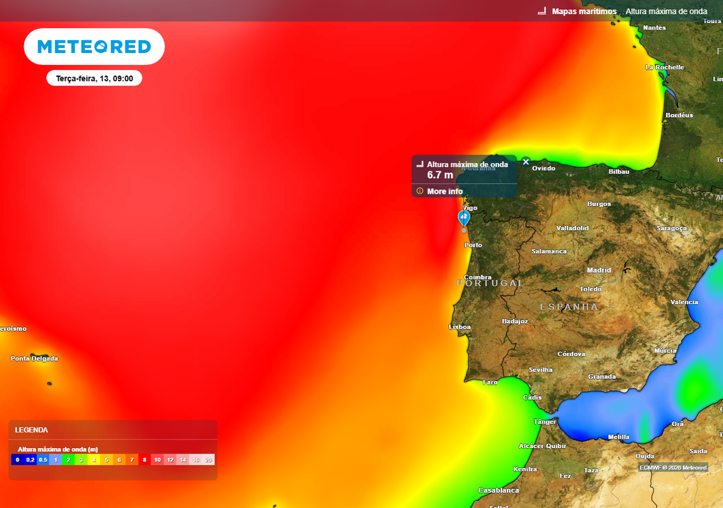 Na terça (13) as ondas poderão atingir uma altura significativa entre 2,5 e 4 metros ao longo de toda a faixa costeira ocidental de Portugal continental. Ao longo de terça (13) e logo a partir da madrugada, a altura máxima da ondulação poderá ser de 6,5 metros no litoral Norte, podendo alcançar os 5 metros na faixa costeira ocidental do litoral Centro e Sul.