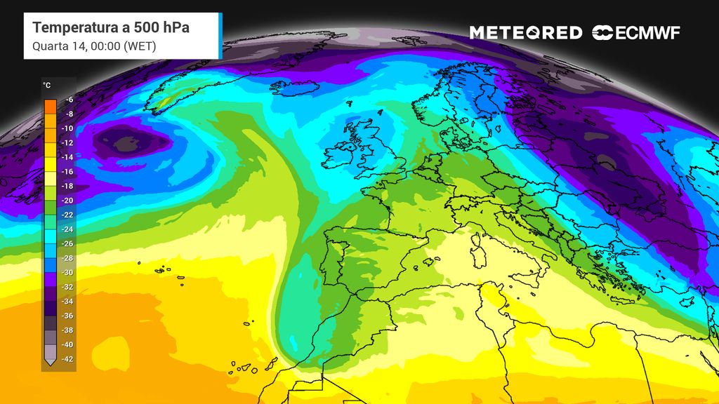 O forte contraste de temperatura entre o ar polar contido pela circulação da depressão e uma massa de ar tropical marítima no interior do anticiclone em crista dará origem a um primeiro sistema frontal ativo. De seguida, analisaremos ao detalhe esta nova mudança no estado do tempo, tendo como referência as mais recentes atualizações do modelo ECMWF (o Europeu).