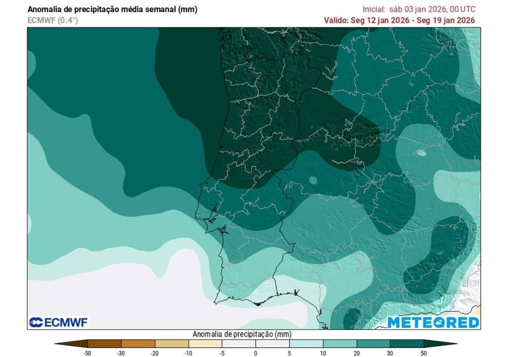 Para a próxima semana (12-19 janeiro), o modelo Europeu mostra que a chuva será provavelmente superior à média de norte a sul de Portugal continental, com anomalias húmidas mais acentuadas nas Regiões Norte, Centro e algumas zonas de Oeste e Vale do Tejo e Alto Alentejo (pelo menos 50 mm acima da média).