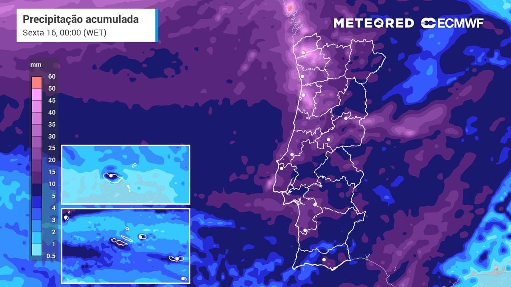 O mapa de precipitação acumulada, válido desde terça-feira (13) até às 22:00 de sexta-feira (16), evidencia um padrão típico de episódios atlânticos em Portugal continental, com valores mais elevados concentrados na faixa costeira e nas regiões de maior relevo. O Noroeste destaca-se claramente, com acumulados que localmente rondam os 90 mm, sobretudo no distritos de Viana do Castelo, resultado da persistência de frentes sucessivas e do efeito orográfico.