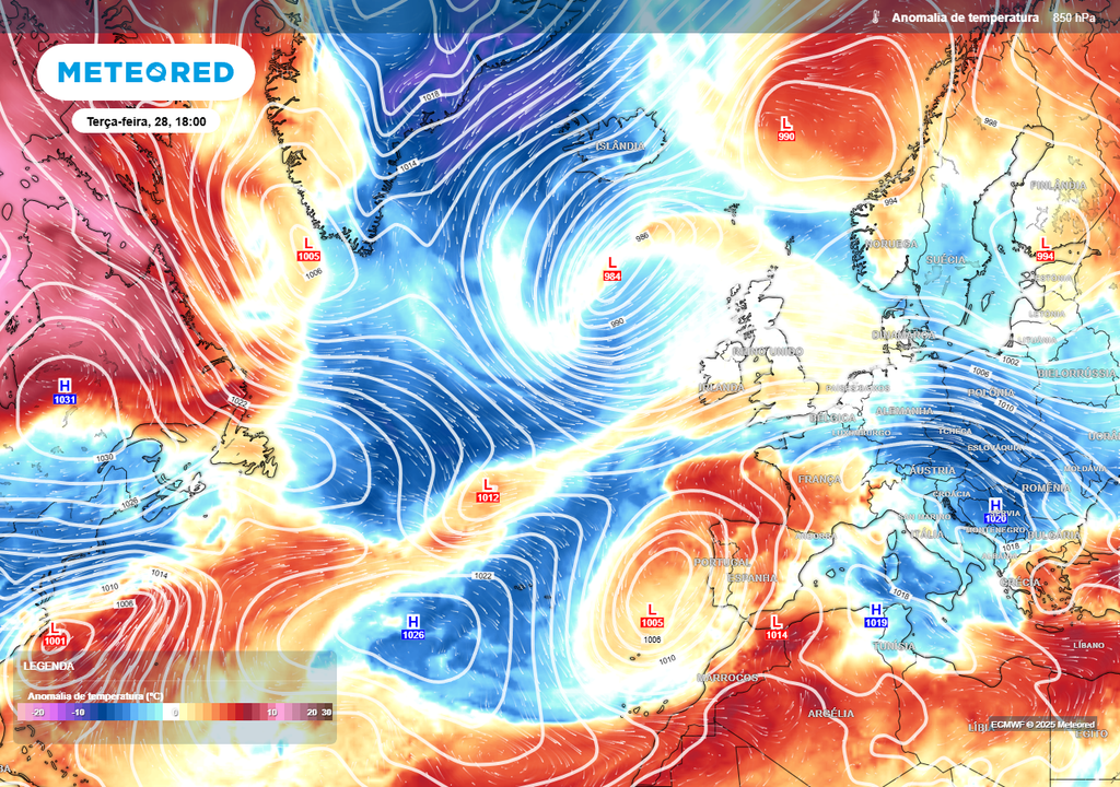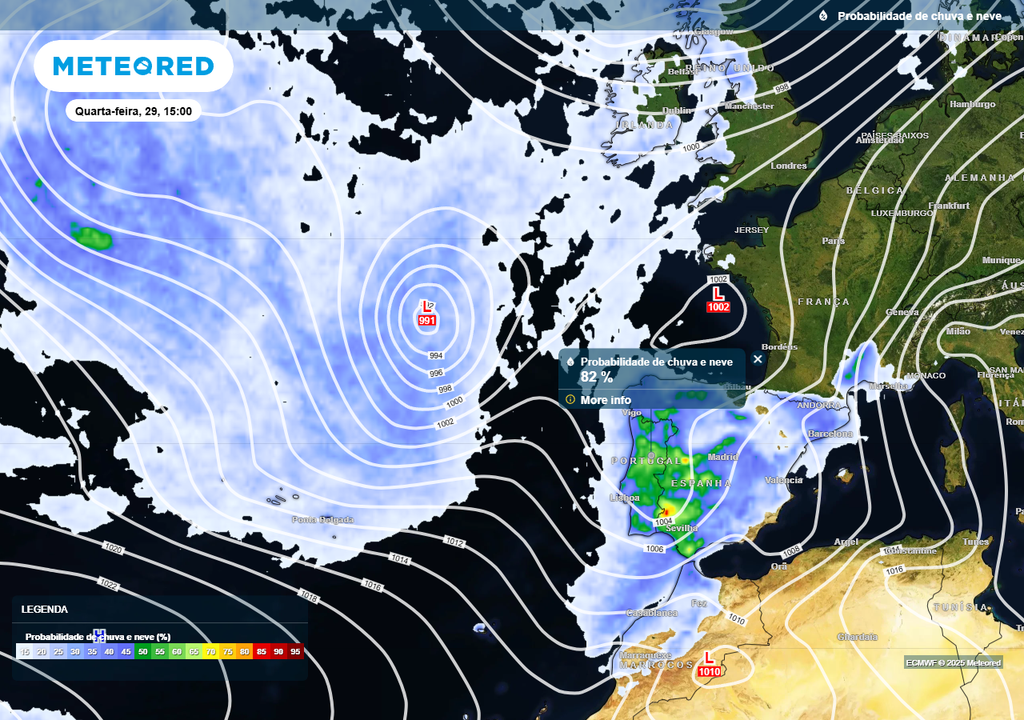 Tal como referido nas últimas previsões da Meteored, a primeira destas grandes depressões a atingir o nosso país chegará entre terça (28) e quarta-feira (29). Situar-se-á em frente à costa ocidental de Portugal continental, com o seu centro posicionado a sudoeste da nossa geografia, sendo impulsionada pelos ventos de Sul (ventos ábregos) e espalhando chuva por toda a geografia.