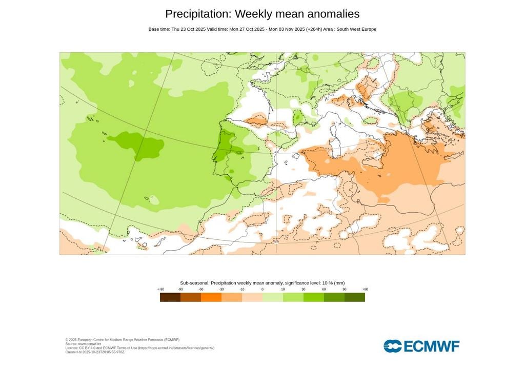De acordo com os mapas de anomalia média semanal de precipitação do modelo Europeu (ECMWF) todas as unidades territoriais portuguesas (Continente, Açores e Madeira) irão registar chuva acima dos valores médios da normal climatológica de referência na semana de 27 de outubro a 2 de novembro.