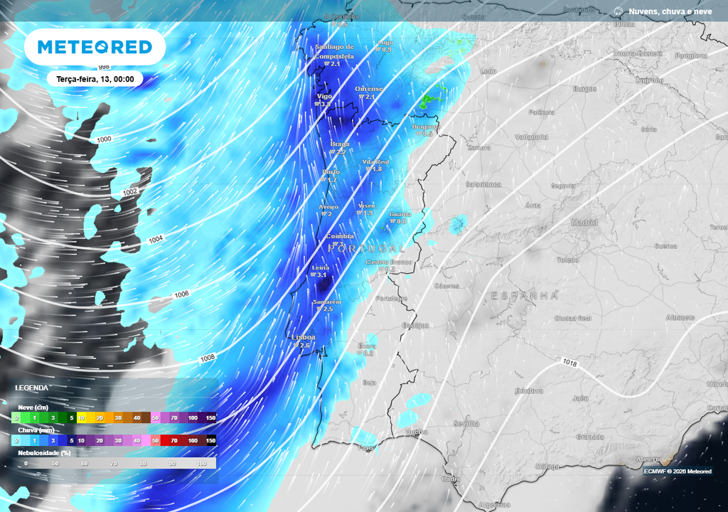 Prevê-se um novo episódio de precipitação generalizada na próxima terça-feira, 13 de janeiro, devido à passagem de uma frente fria atlântica.