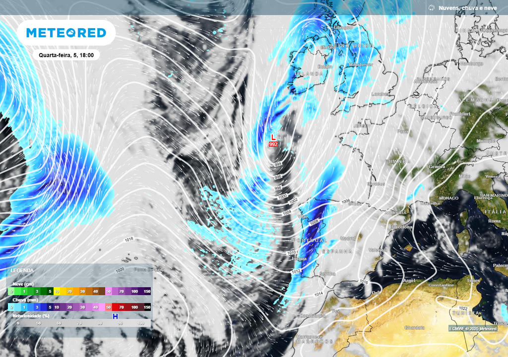 Na quarta-feira (5) prevê-se que a ondulação frontal dê lugar a uma frente fria, mais organizada e ativa, que distribuirá chuva de noroeste para sudeste de Portugal continental, deixando chuva generalizada.