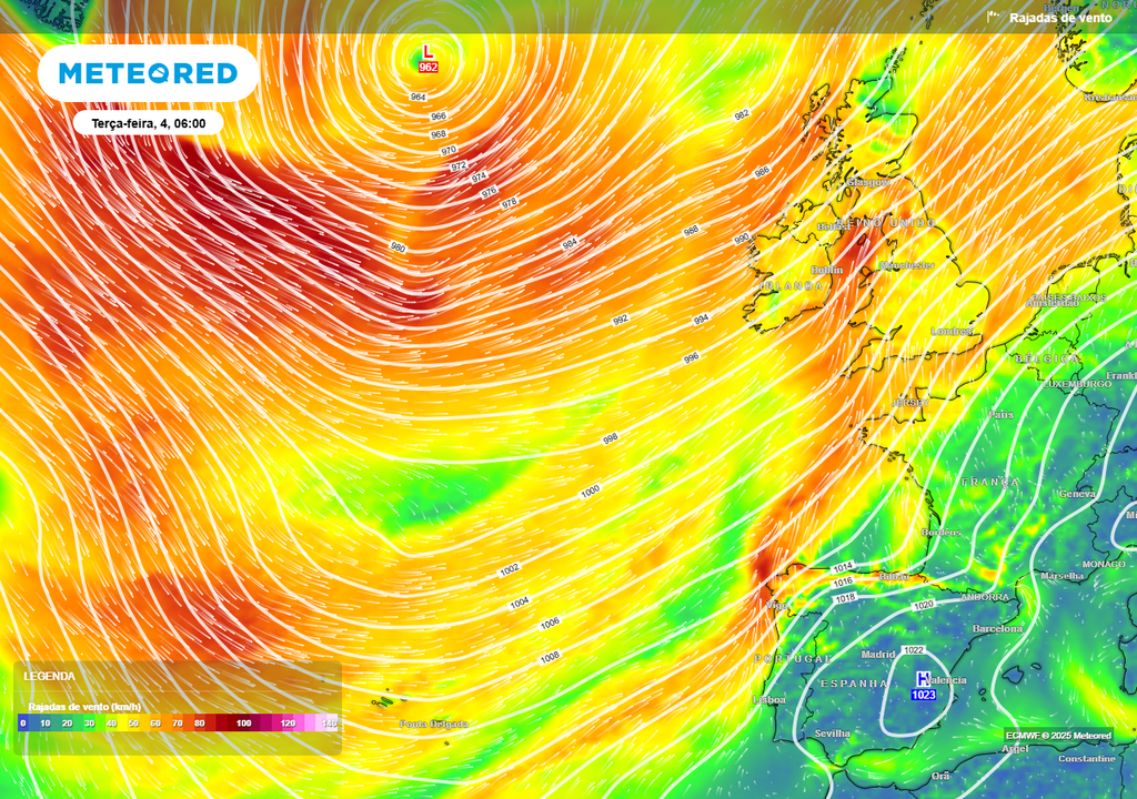 Na terça-feira (4) a precipitação ficaria maioritariamente confinada à Região Norte, podendo roçar algumas zonas do Centro. Será gerada por uma ondulação frontal associada à tal baixa pressão secundária que provavelmente se desenvolverá a noroeste da Península Ibérica e posteriormente se deslocará rumo às Ilhas Britânicas.
