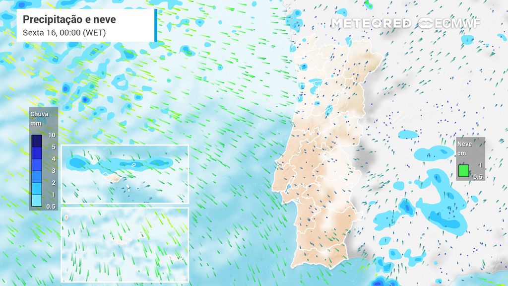 Segundo os nossos mapas, o período de chuva mais intensa e persistente poderá ter início pelas 13h, prolongando-se até às 16h. Todavia, é expectável que pelas 15h a chuva seja mais abundante, podendo contar com descargas até cerca de 6 mm por hora, especialmente no Norte e Centro do distrito. Depois deste episódio mais abundante, o nosso modelo de confiança, ECMWF, mostra uma melhoria do estado de tempo nesta região, devendo dar-se uma dissipação total da precipitação.
