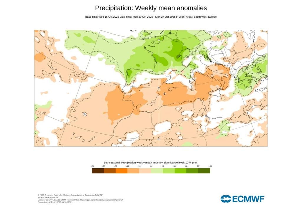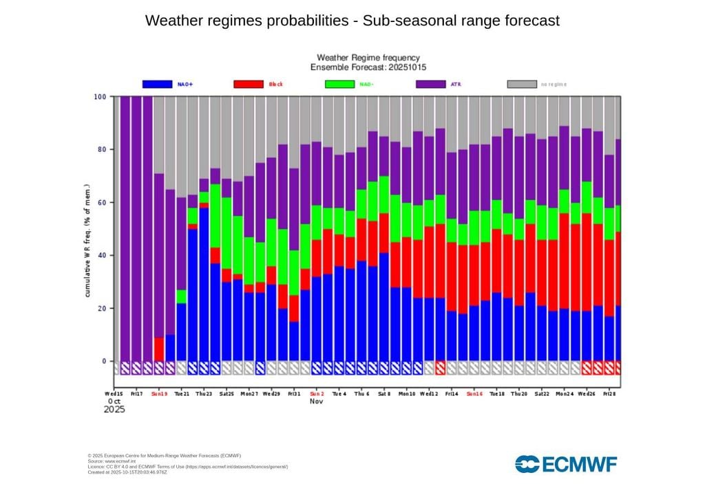 Porém, nesta ocasião, há uma nuance em relação à chuva que se destaca para Portugal continental, corroborada tanto pelo mapa semanal de anomalia de precipitação do modelo ECMWF, como pelo mapa gráfico de regimes meteorológicos a médio e longo prazo deste mesmo modelo. Abaixo explicamos em que consistirá esta nuance, relacionada com a atual previsão da distribuição de chuva para a próxima semana (20-26 outubro).