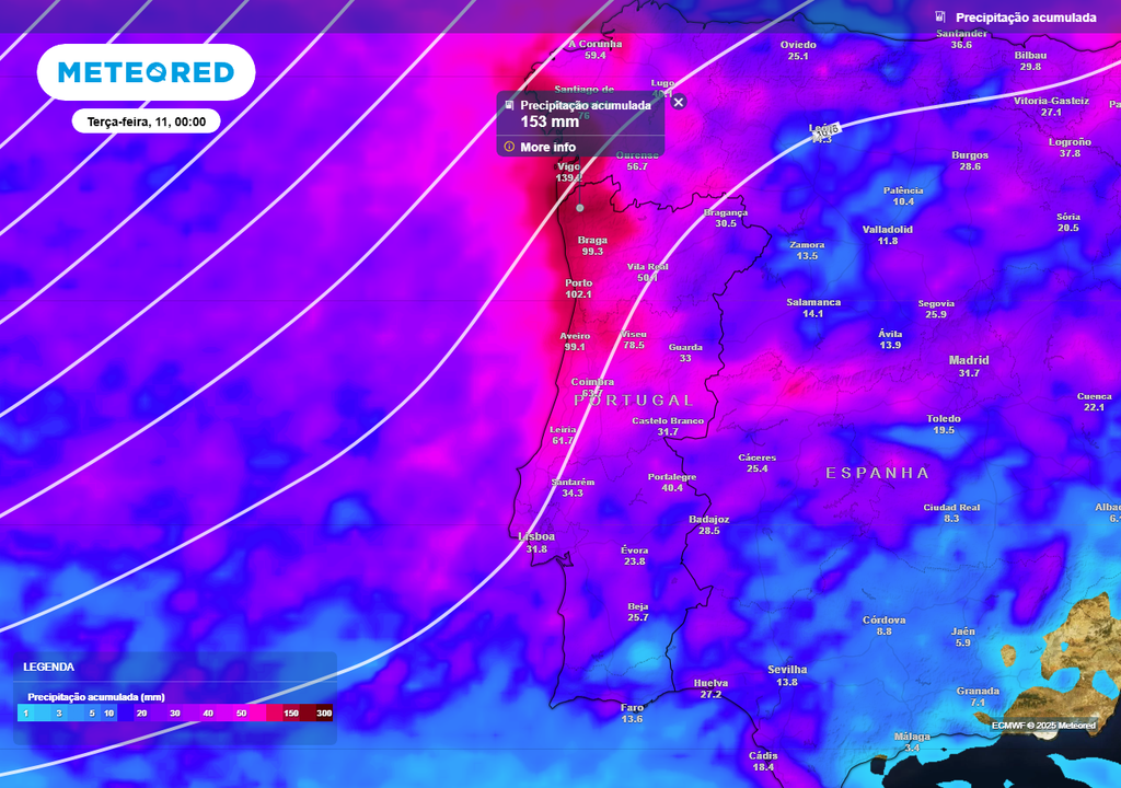 Segundo o modelo europeu, alguns dos dias mais chuvosos poderão ser quarta e quinta-feira, dias 12 e 13 de novembro, embora a distância temporal ainda seja demasiado distante para fornecer mais pormenores.