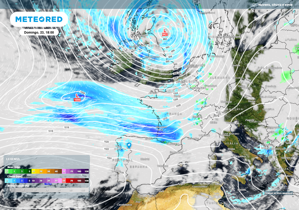 Nas últimas horas de domingo (23) uma segunda frente, associada a um vale depressionário que surgirá nas redondezas do Golfo da Biscaia, alimentará a linha de instabilidade, reforçando a chuva e espalhando-a por outros locais do Norte e Centro.