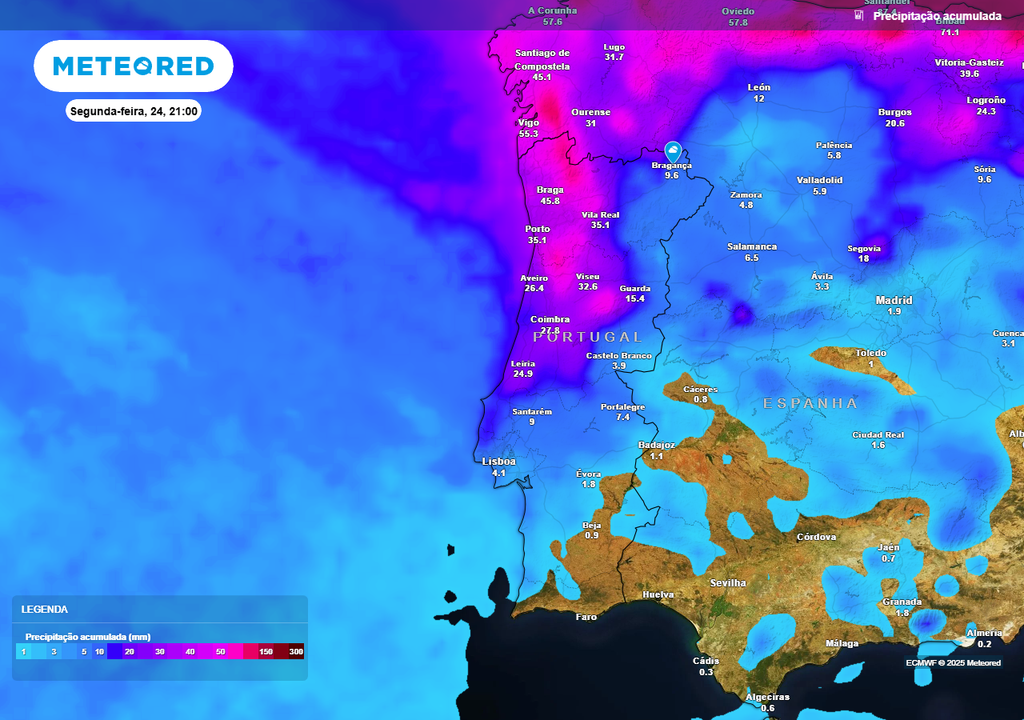 De um modo geral, todo o país será afetado pela chuva e pelo vento na próxima segunda-feira (24), mas quanto mais a norte e a oeste (grosso modo distritos de Viana do Castelo, Braga, Porto, Aveiro e setores ocidentais dos distritos de Vila Real e Viseu), mais intensos serão os fenómenos meteorológicos adversos. É claro que zonas do litoral Centro, do interior Norte e da zona da Serra da Estrela, por razões de latitude ou orografia, também poderão registar bons volumes de precipitação, mas de uma maneira menos intensa.