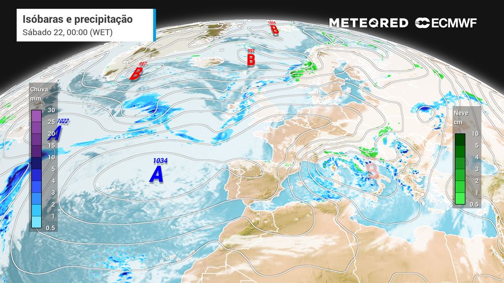 Ainda no dia de sábado (22) assistiremos à alteração na configuração sinóptica anunciada pelos mapas de referência da Meteored. O vento, até então a soprar predominantemente do quadrante Norte, passará a soprar de Oeste, sinalizando a iminente mudança no estado do tempo, que se traduzirá pela chegada de frentes atlânticas de fraca a moderada atividade.