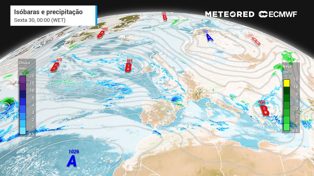 O Atlântico Nordeste continuará a ser um “ninho” de tempestades nos próximos dias e Portugal será um dos países mais afetados por esta configuração sinóptica: prevê-se chuva generalizada, vento intenso, queda de neve e agitação marítima agreste em toda a faixa costeira ocidental.