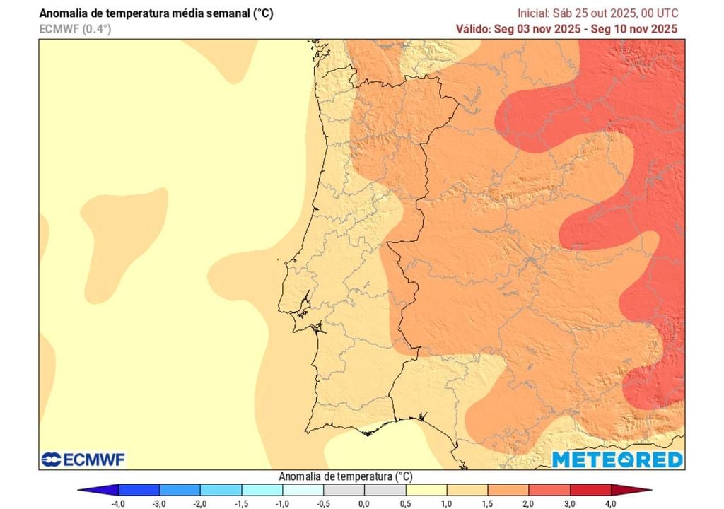 As últimas previsões do nosso modelo de confiança indicam, para o período entre 1 e 9 de novembro, a persistência de um ambiente temperado ou ameno, com temperaturas que poderão estar entre 1 a 2 ºC acima da média para esta época do ano em Portugal continental, estando as anomalias térmicas mais acentuadas (+2 ºC) previstas para o interior Norte e Centro (distritos de Vila Real, Viseu, Bragança e Guarda) e zonas fronteiriças da Beira Baixa e do Alentejo. São expectáveis anomalias mais suaves no arquipélago da Madeira e em grande parte do arquipélago dos Açores (até 1 ºC acima do normal).