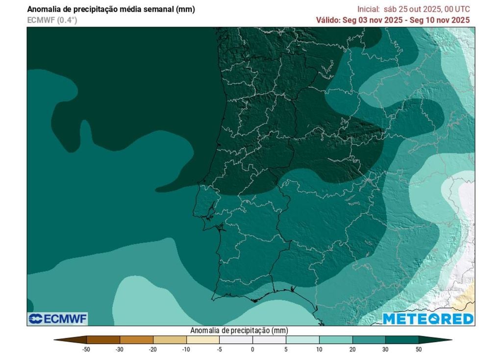 No que diz respeito à chuva o cenário torna-se mais complexo e complicado de prever, dado que estamos numa estação extremamente variável e só é possível fazer algumas aproximações ou tendências muito gerais. Até 10 de novembro, o modelo Europeu prevê precipitação superior à média da época de norte a sul de Portugal continental, sendo especialmente abundante nas regiões a norte do Tejo (Norte e Centro) e em algumas zonas do Ribatejo e do Alto Alentejo, onde se vislumbram anomalias de precipitação positivas bastante expressivas (mais de 50 mm acima do normal).