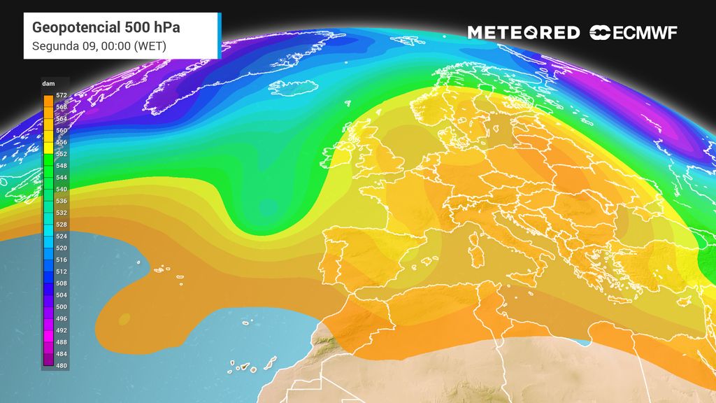 O jato polar continua muito ondulado e irá produzir um vale depressionário (ou cavado) com ar polar e vindo do Atlântico. Na sexta-feira (6) isolar-se-á em altitude sobre a Península Ibérica, dando origem a uma nova gota fria, tal como se observa neste mapa da temperatura a 500 hPa.