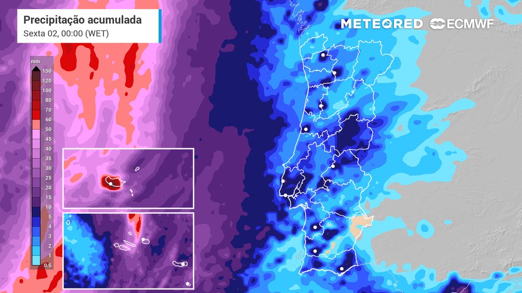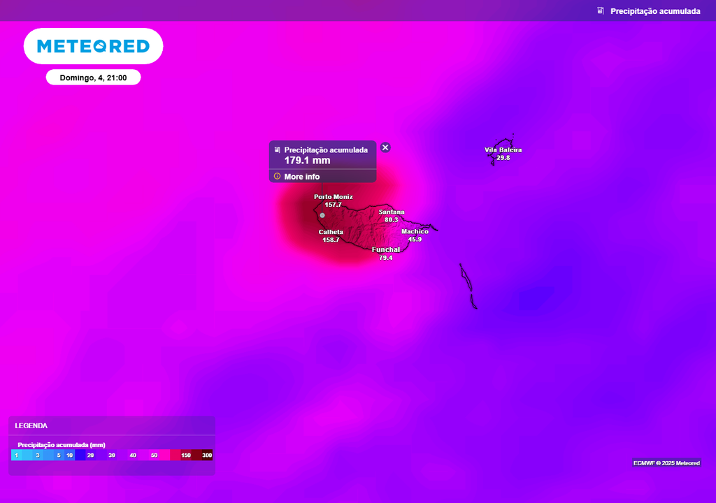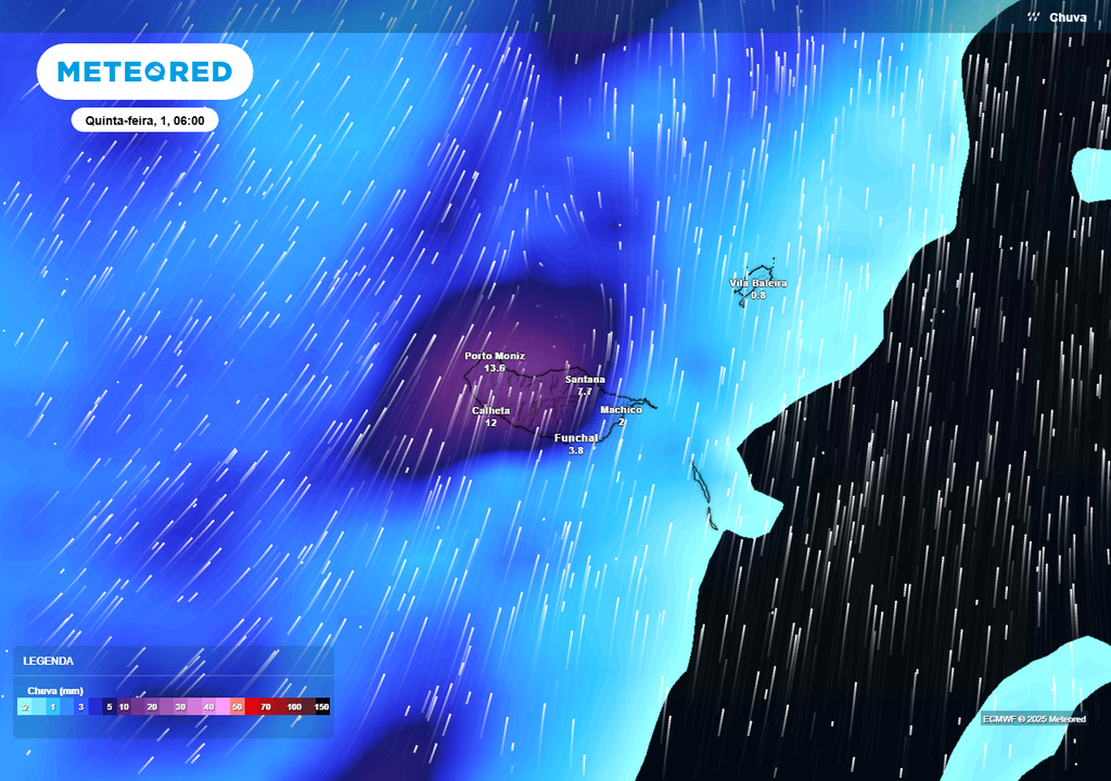 Com os modelos globais é difícil prever acumulações precisas devido à complexa orografia do arquipélago da Madeira, mas a atual previsão dos mapas de referência da Meteored revela que é provável que possam cair entre 100 e 120 mm de chuva até ao final do dia de Ano Novo (quinta-feira, 1 de janeiro) nas zonas mais expostas da Madeira (parte oeste, vertente sul e regiões montanhosas). No entanto, também poderá ocorrer chuva pontualmente forte noutras zonas da ilha da Madeira.