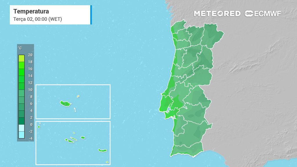 Na terça-feira (2) as temperaturas sobem ligeiramente face a segunda-feira (1). No Norte, as mínimas deverão situar-se, em geral, entre 3 e 6 °C nas cidades do litoral (Porto, Viana do Castelo, Braga) e com máximas a rondar 11–14 °C. No litoral centro preveem-se mínimas entre 4 e 7 °C e máximas de 13–15 °C, enquanto o interior mantém madrugadas frias, com valores próximos de 1-3 °C e máximas de 9-12 °C. No Alentejo e Algarve a noite será menos rigorosa, com mínimas a oscilar entre 5 e 9 °C, subindo até 14–17 °C durante a tarde, sobretudo junto à faixa litoral sul.