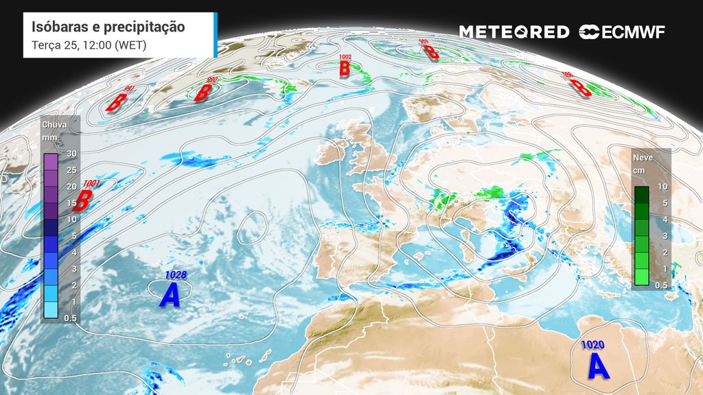 Esse tipo de configuração aumenta a probabilidade de períodos com chuva persistente, vento forte e episódios de neve mais significativos em altitude.