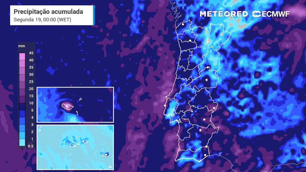 A chuva inicia-se no litoral e progride para o interior, abrangendo grande parte do território ao longo dos diferentes episódios frontais. As regiões Norte e Centro concentram os maiores acumulados, resultado da maior exposição à circulação atlântica e da interação com o relevo, enquanto no Sul a precipitação surge de forma mais descontínua.