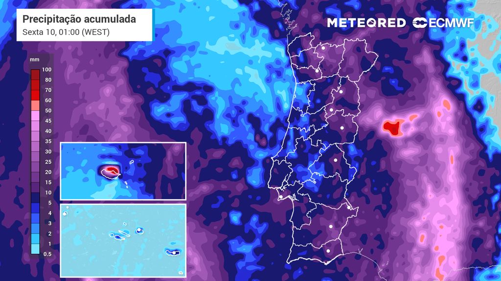 Com isto, é esperado que nas próximas horas, já no início da tarde, a chuva se mova de oeste para este, levando períodos de chuva mais intensa para o interior do país, especialmente entre os distritos de Castelo Branco e Beja. No entanto, é expectável uma dissipação generalizada e gradual a partir das 19h, esperando-se que a mesma possa persistir no Nordeste do país ao longo da madrugada de quarta-feira.
