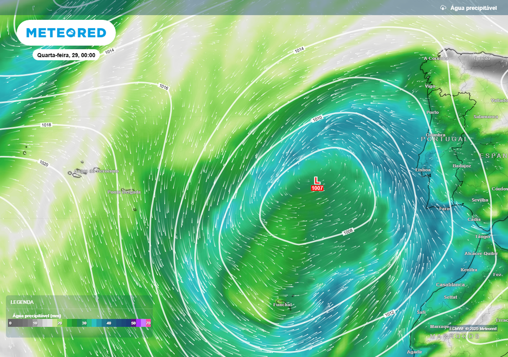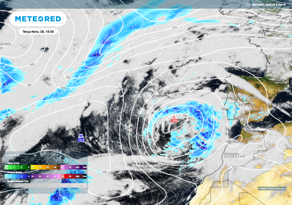 Para terça-feira (28) vislumbra-se a possibilidade das primeiras linhas de instabilidade associadas a uma depressão formada a oeste do nosso país, começarem a regar as regiões situadas a sul do Tejo, com a chuva a estender-se para norte e a afetar todo o país na quarta (29) e na quinta-feira (30).
