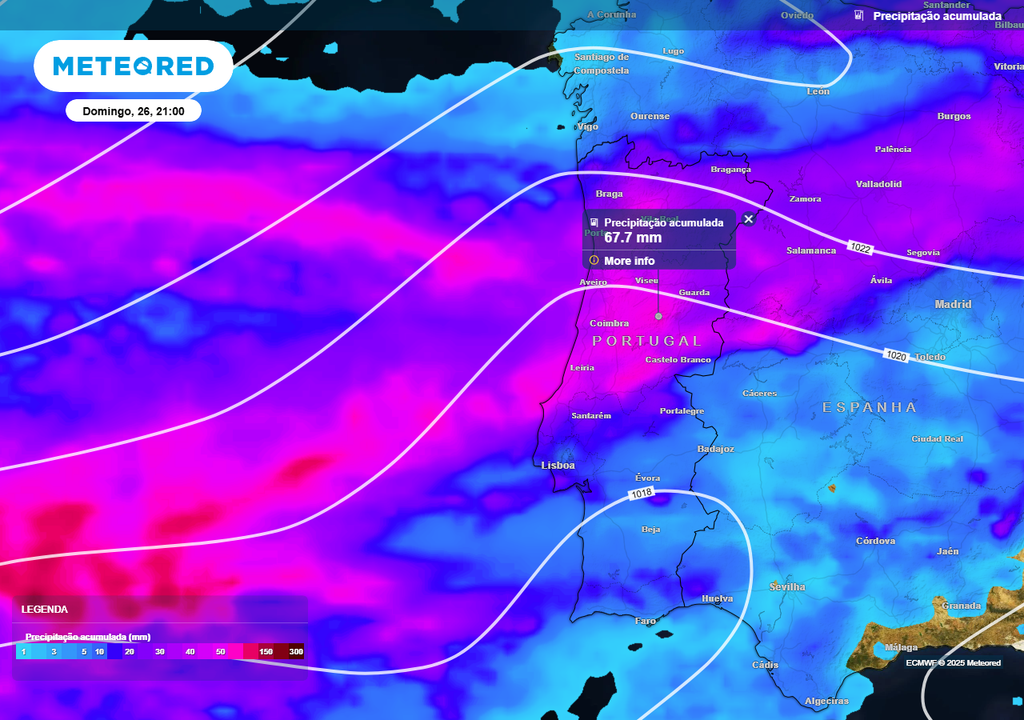 Se as atuais previsões dos mapas de referência da Meteored se cumprirem, segunda-feira, 27 de outubro, seria o único dia da próxima semana com ausência de chuva no Norte e Centro de Portugal continental (embora essa possibilidade esteja prevista para o Baixo Alentejo e Algarve).