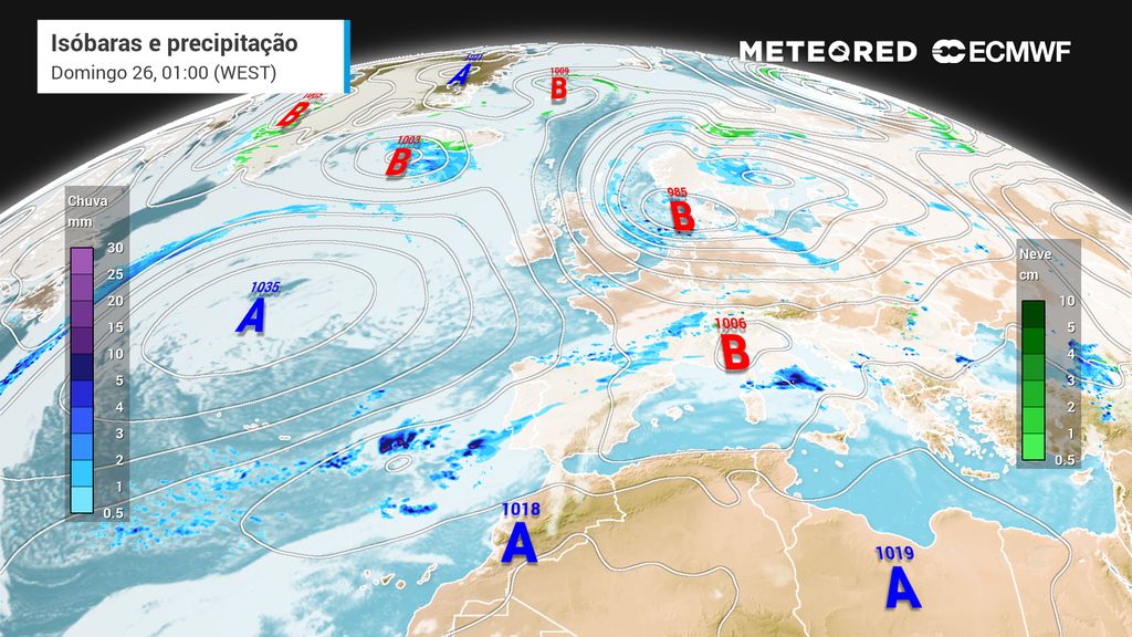 A presente configuração sinóptica traduz-se numa ampla faixa de centros de baixa pressões (principais e secundários) situados entre a Islândia e a Rússia, e na presença de altas pressões temporariamente mais deslocadas para sul.
