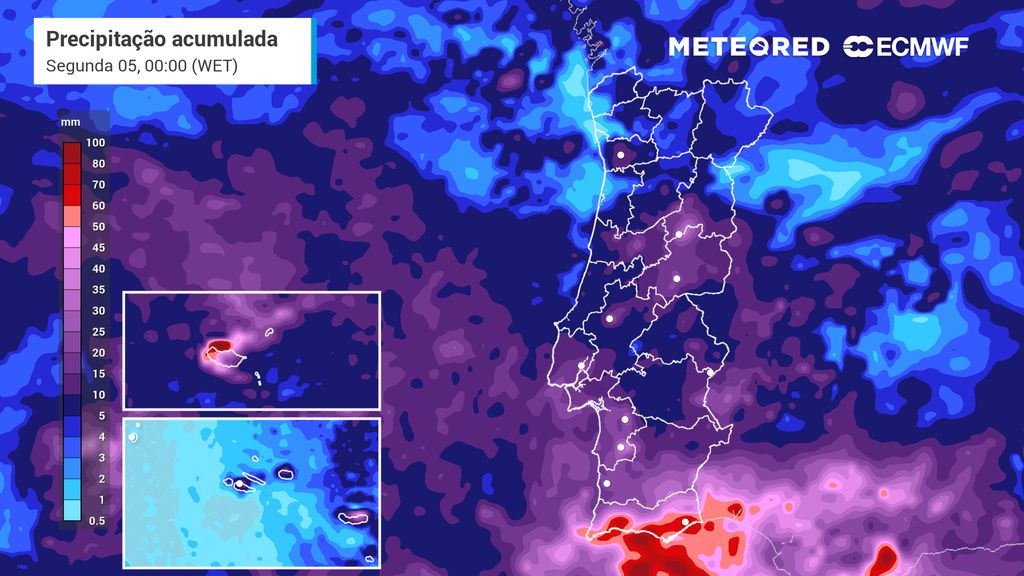 Desta forma, espera-se que, até às últimas horas do dia 4, a acumulação de precipitação seja mais elevada nestas duas regiões (Algarve e Estrela). A primeira poderá contar com valores de cerca de 98 mm (entre Loulé e Tavira), enquanto a segunda poderá registar até 58 mm.