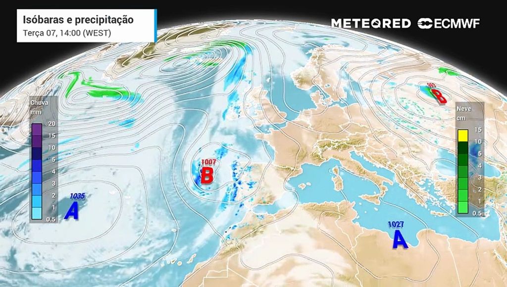 Contrariamente ao que se poderia esperar de um “anticiclone”, este bloqueio não garante tempo seco em Portugal. Pelo contrário, ao desviar a circulação atlântica, pode favorecer a entrada de frentes e depressões em direção ao território.