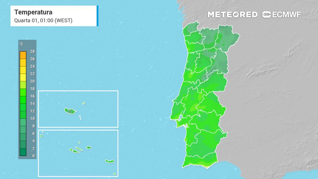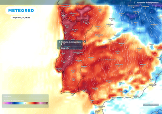 De Norte a Sul do país, poderão ser registadas temperaturas máximas até 7 ºC acima da normal climatológica (zonas a vermelho mais escuro). Estas anomalias amenizam no período noturno, onde no interior manter-se-ão positivas, na ordem dos 2/3 ºC acima do normal e no litoral poderão ser negativas ou nulas, com valores abaixo da média até 1 ºC ou dentro do esperado.