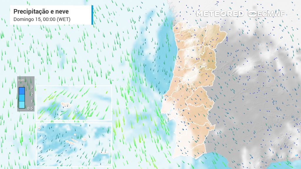 No restante litoral Norte, os acumulados mantêm-se também relativamente relevantes, embora ligeiramente inferiores (até 7 mm), enquanto no interior Centro e no Nordeste Transmontano os valores descem de forma significativa. A Serra da Estrela poderá contar com mais acumulação face às áreas adjacentes (até 5 mm).
