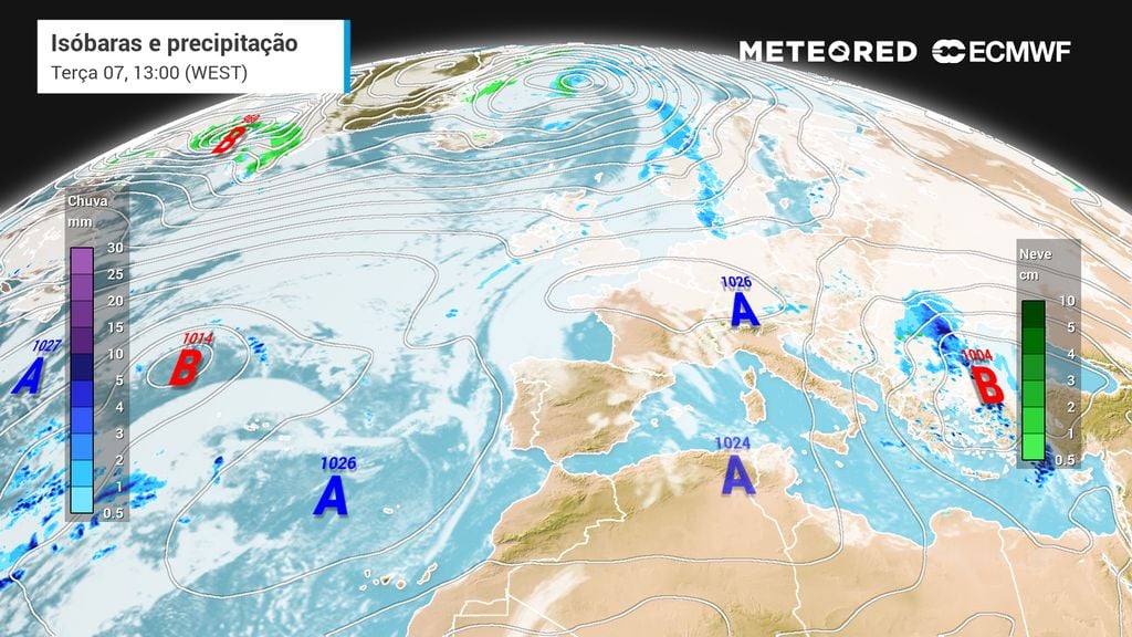 O anticiclone, em fase de reforço, desloca-se gradualmente para norte, em direção ao golfo da Biscaia, o que provoca vento de leste e nordeste, responsável pela descida da humidade relativa e pela subida das temperaturas diurnas. Assim, o início da semana será dominado por céu geralmente limpo ou pouco nublado, vento moderado a forte nas terras altas, e um ambiente termicamente muito ameno, tanto de dia como de noite.
