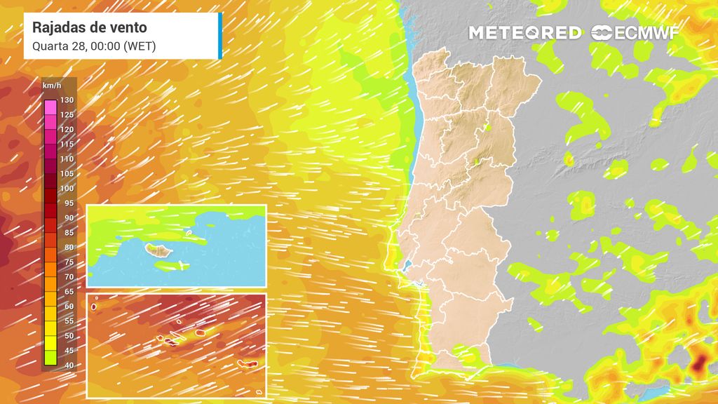 O vento terá um papel central nos próximos dias. As previsões apontam para rajadas que podem atingir cerca de 110 km/h nas ilhas mais a oeste, Flores e Corvo, valores elevados que refletem a maior exposição destas ilhas à circulação de noroeste.