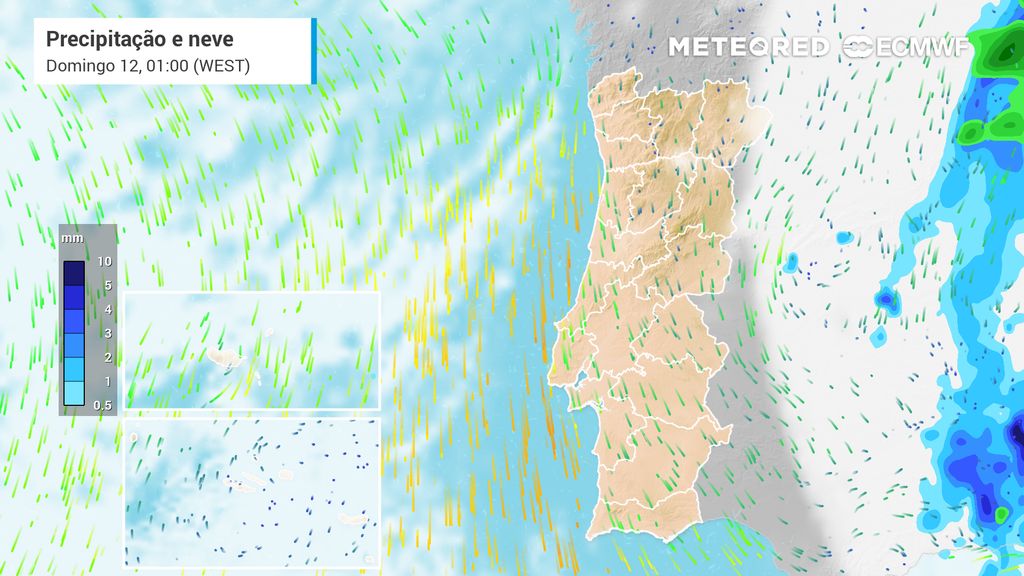 Porém, as linhas de instabilidade produzidas pelo sistema depressionário à medida que este se for deslocando para leste em direção a Marrocos, atingirão o território insular português sob a forma de precipitação convectiva: aguaceiros, por vezes fortes, ocasionalmente sob a forma de granizo e potencialmente acompanhados de trovoada, não se excluindo que possa nevar nos pontos mais elevados da ilha da Madeira.