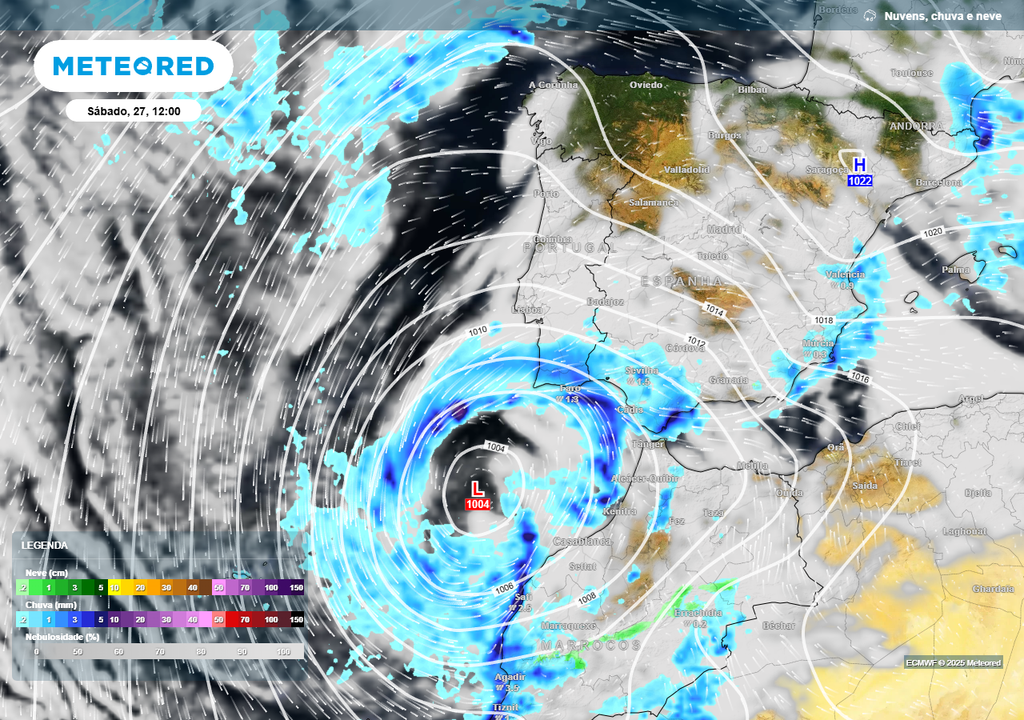 Para sábado, 27 de dezembro, a mesma baixa pressão do dia anterior já terá o seu centro muito mais a sul, posicionado a sudoeste do Algarve e a noroeste de Marrocos.