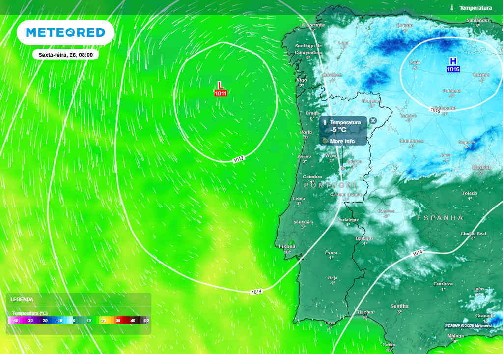 A madrugada e início da manhã de sexta-feira (26) será o período mais frio da semana. Os mapas preveem temperaturas mínimas negativas em vastas zonas do interior Norte e Centro, e inclusive alastrando-se ao Alto Alentejo.
