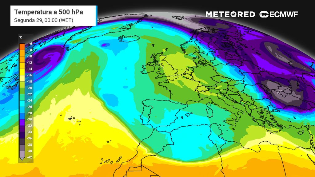 Neste mapa da temperatura a 5500 metros de altitude observa-se a pequena baixa pressão - situada a sudoeste do Algarve - que resultará no regresso de períodos de chuva ou aguaceiros, por vezes fortes e sob a forma de granizo, e potencialmente acompanhados de trovoada no Centro e Sul de Portugal continental no sábado (27). Com o vento de Leste, alguma humidade marítima recolhida na sua trajetória e contendo ar polar continental na sua estrutura, esta baixa pressão também resultará na potencial queda de neve a cotas médias/baixas nas zonas montanhosas do Centro.