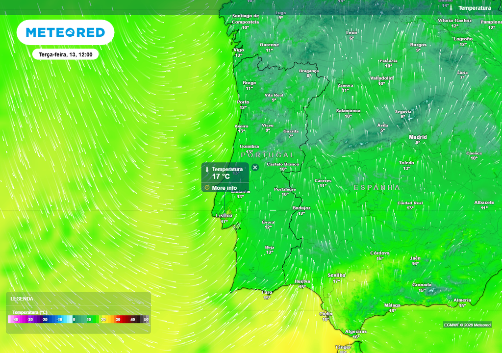 Na terça-feira (13) espera-se um panorama bastante nublado e chuvoso, especialmente na primeira metade do dia e em particular na madrugada e primeiras horas da manhã. Nesse período a frente percorrerá praticamente todo o território de Portugal continental de oeste para leste.
