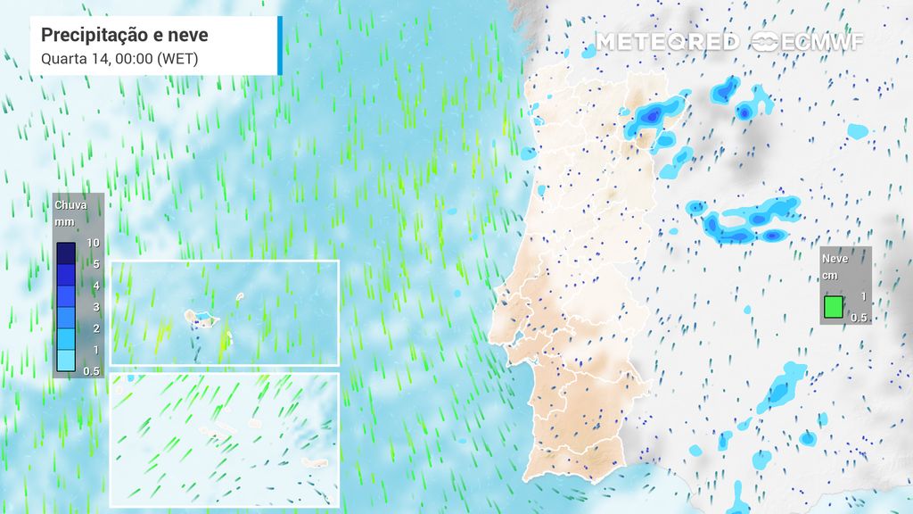 O modelo Europeu antecipa, até ao final de terça-feira (13), entre 5 e 25 mm de chuva acumulada em grande parte do país. Prevê ainda que o Minho, a zona da Serra da Estrela e algumas partes dos distritos de Porto, Aveiro e Vila Real somem mais 30 a 50 mm de chuva, o que resultaria num total de 55 a 75 mm de precipitação acumulada ao cabo dos dois primeiros dias da semana.