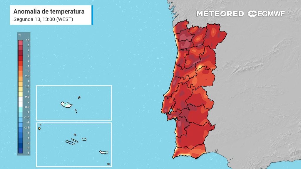 As anomalias das temperaturas máximas situar-se-ão entre os 6 ºC e os 8 ºC em boa parte do território nacional.
