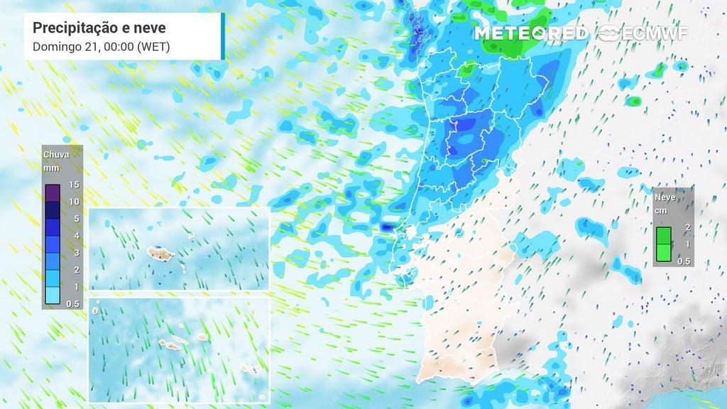 É entre domingo (21) e segunda-feira (22) que o cenário invernal ganha maior destaque. Na madrugada de domingo, o Parque Nacional da Peneda-Gerês surge como o local com maior altura de neve por hora, com valores próximos de 2,7 cm.