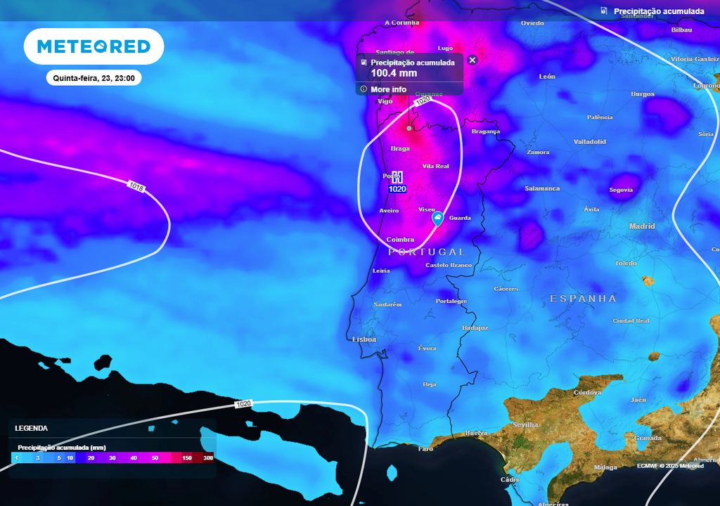 Os mapas de referência da Meteored, baseados no modelo ECMWF, estimam que o período mais crítico do temporal de vento na Região Norte (e em algumas zonas do Centro) de Portugal continental, gerado pela passagem de uma depressão a sul das Ilhas Britânicas, ocorrerá entre as 18:00 de quarta-feira (22) e as 10:00 de quinta-feira (23).