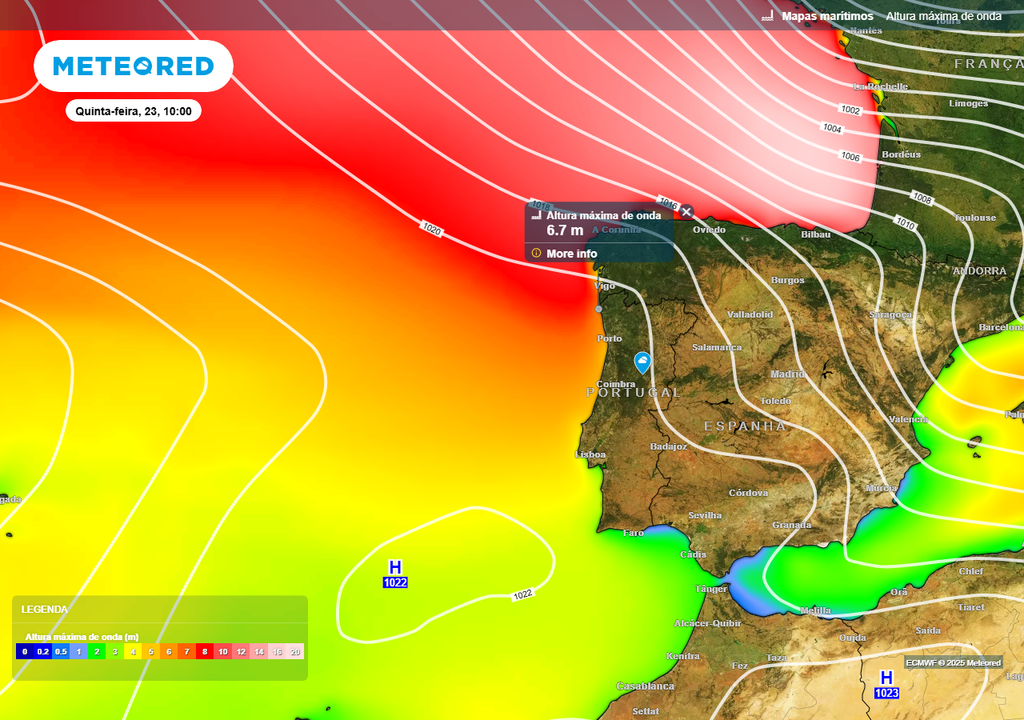 É igualmente expectável uma forte agitação marítima na faixa costeira ocidental de Portugal continental, em particular a norte do Cabo Carvoeiro. Os mapas da Meteored antecipam uma altura máxima de onda entre os 4 e os 7 metros, a partir das 21:00 de quarta-feira, dia 22 e até as 18:00 de quinta-feira, dia 23 para o litoral Norte (litoral dos distritos de Viana do Castelo, Braga e Porto, sendo os minhotos os mais expostos, isto é, aqueles que poderão registar valores mais elevados).