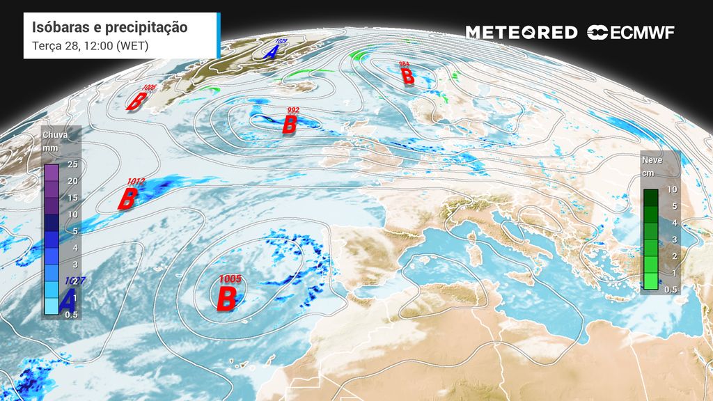 Em termos sinópticos, o cenário corresponde a um Atlântico perturbado, NAO perto do negativo e anticiclone dos Açores menos influente, permitindo a passagem de cavados a latitudes médias. A atividade tropical a sotavento funciona como reserva adicional de humidade, embora sem impacte direto esperado nesta janela.