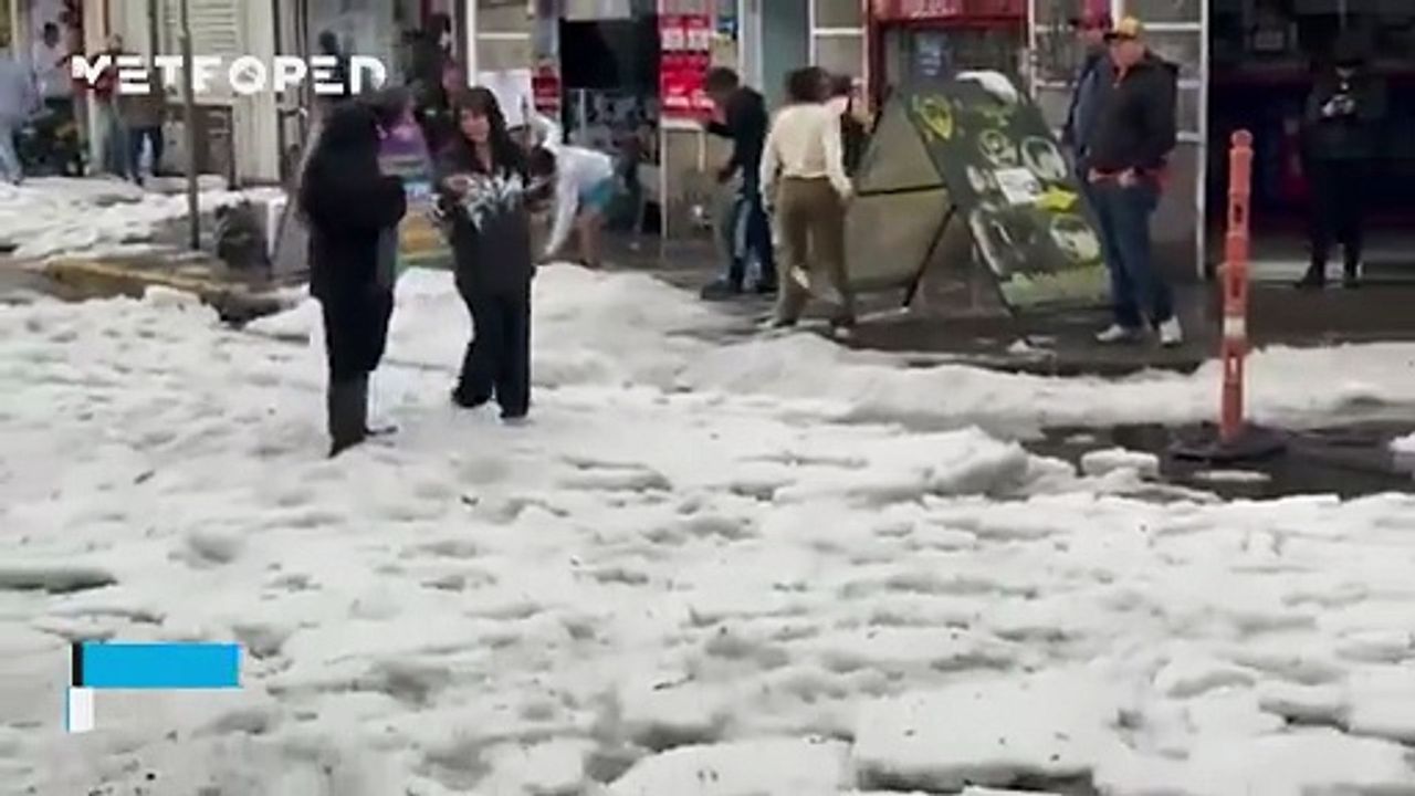 Uma enorme tempestade de granizo cobre as ruas de Bogotá, na Colômbia, com uma camada branca de neve